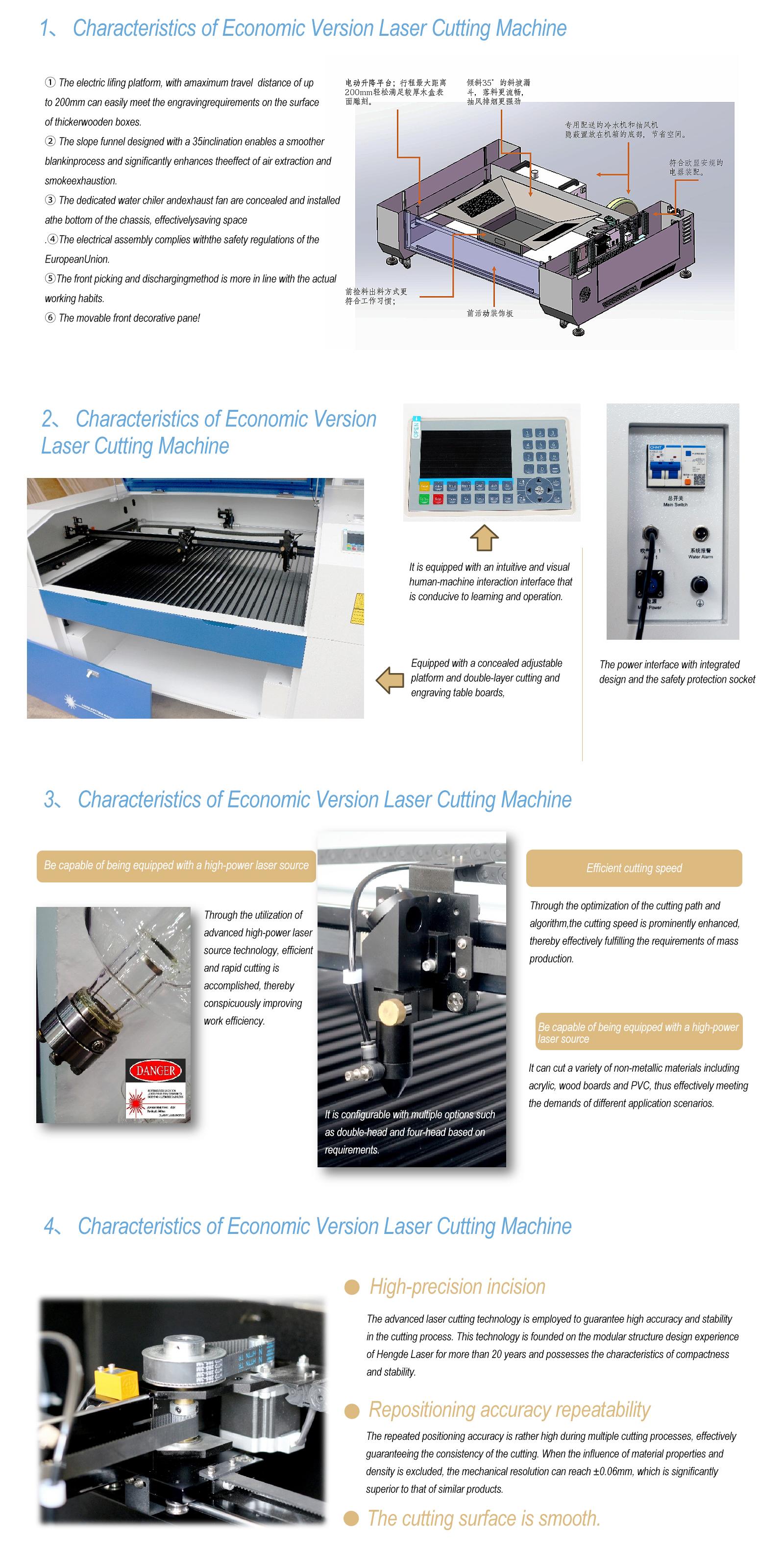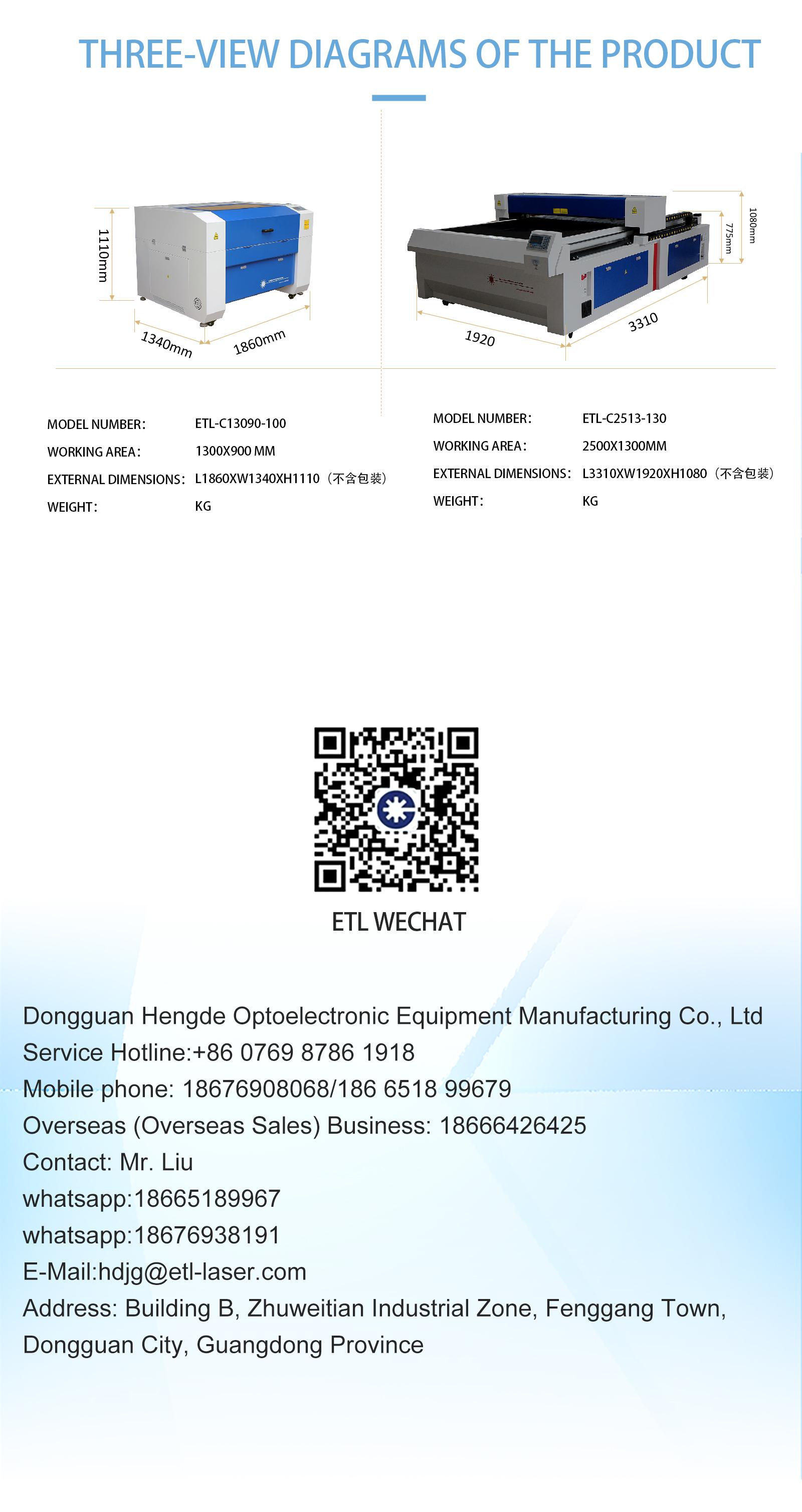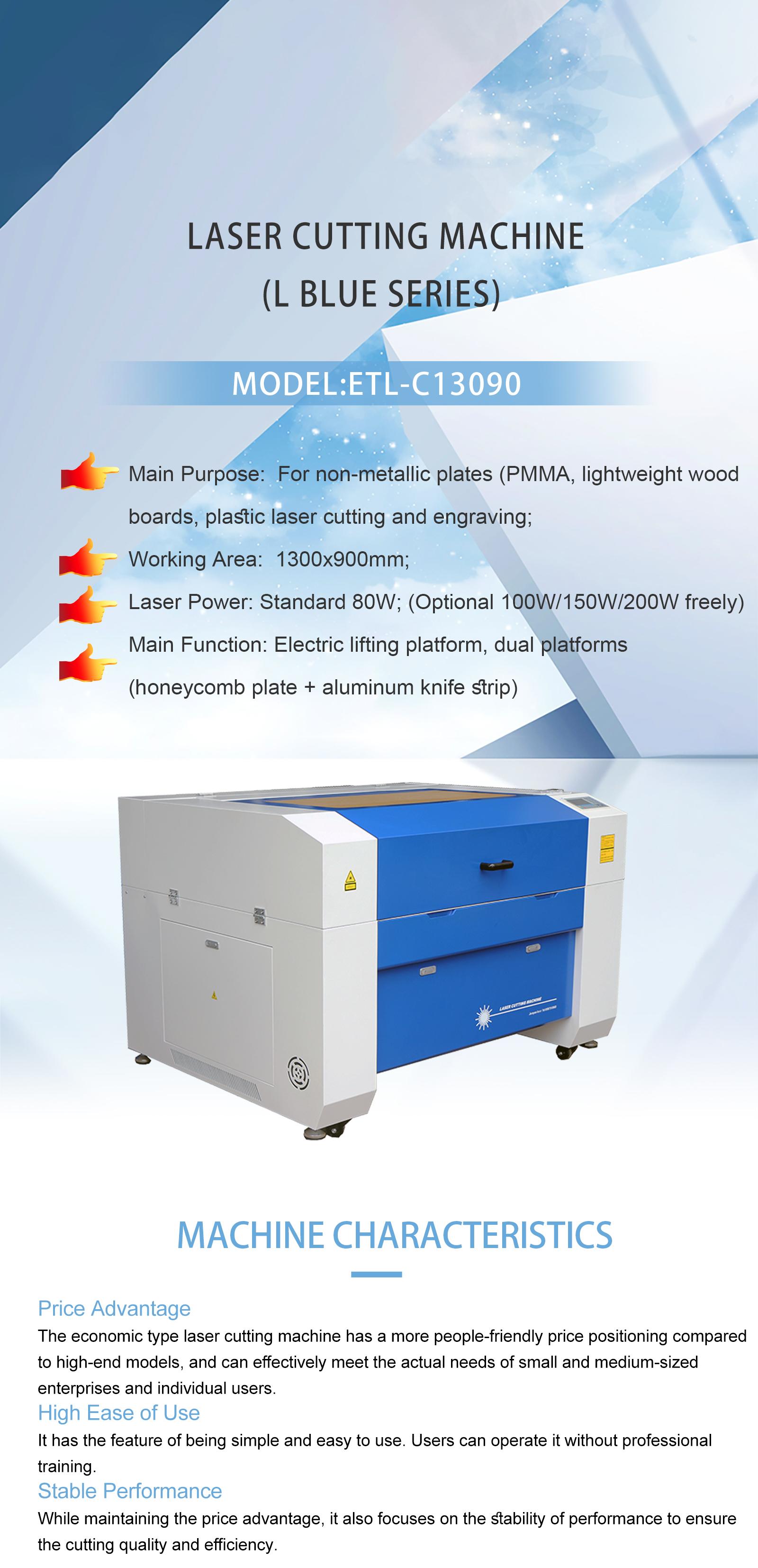 The ETL-C13090 CO2 Laser Cutting Machine is a versatile and high-precision solution designed for both cutting and engraving a wide array of non-metallic materials. With a generous $1300mm \times 900mm$ working area, the ETL-C13090 is perfect for processing acrylic, wood, leather, and textiles with exceptional detail and smooth edges. Its robust design, coupled with an intuitive control system, makes it the go-to choice for advertising, signage, and craft industries looking for reliable performance and industrial-grade accuracy.