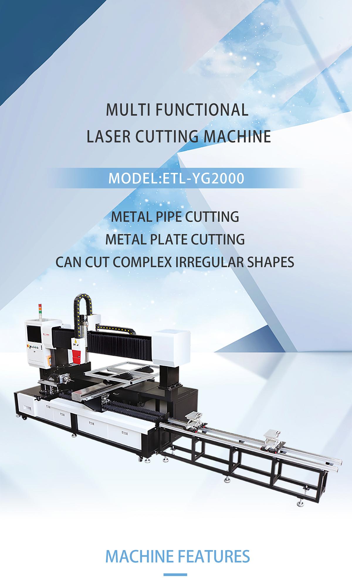 The ETL-YG2000 is a highly versatile laser cutting system engineered for heavy-duty and complex geometries. Specialized in processing thick-wall and special-shaped pipes, it features a unique capability to handle large diameters up to 500mm for conical or hat-shaped components. With a customizable placement length up to 6 meters and a dedicated 1000x1000mm small plate cutting area, the ETL-YG2000 offers an all-in-one solution for diverse industrial needs. Whether for continuous tube processing or precision plate fabrication, this machine delivers unmatched flexibility and performance for customized manufacturing.